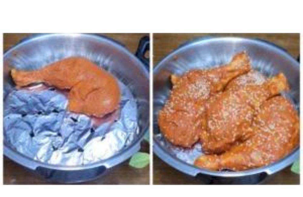 पानी में पहले स्टैंड या कटोरी रखे उसके उपर फॉयल पेपर वाली प्लेट रखे और उसपर चिकन के पीसेस रखे, और उपर से इसे सफेद तिल से गार्निश कर दें।