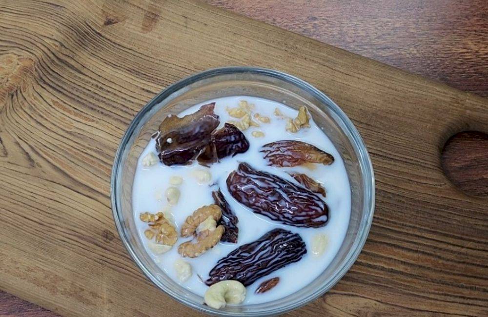 इसे बनाने के लिए एक बाउल में डालें ¼ कप बादाम,¼ कप काजू, 3-4 अखरोट, 4-5 सुखी खजूर (बारीक काट लें) और ½ कप दूध, और इसे 20 मिनट के लिए भीगा कर रखें ताकि ड्राई फ्रूट्स सॉफ्ट हो जाए।