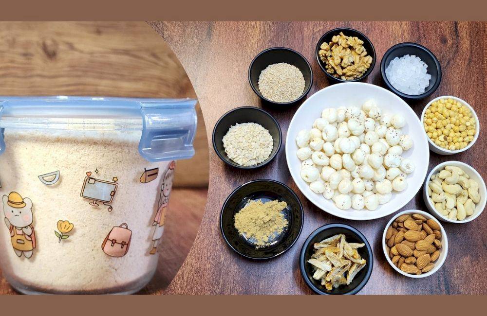 अब इस पाउडर को मखाने के पाउडर वाले बाउल में डालें और चम्मच की मदद से इसे अच्छे से मिला ले ताकि दोनो पाउडर मिक्स हो जाएं।