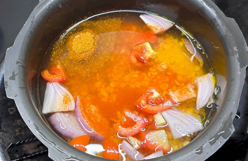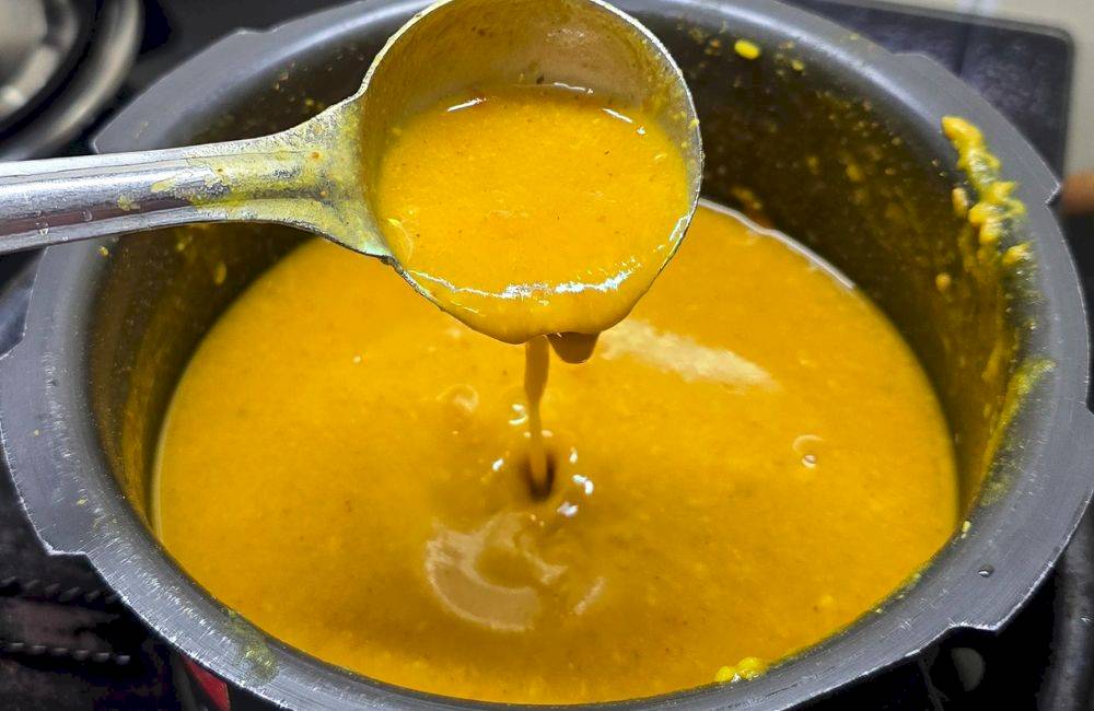 After the pressure is released, open the lid and check if the dal is cooked. If not, cook for another 2-3 whistles.