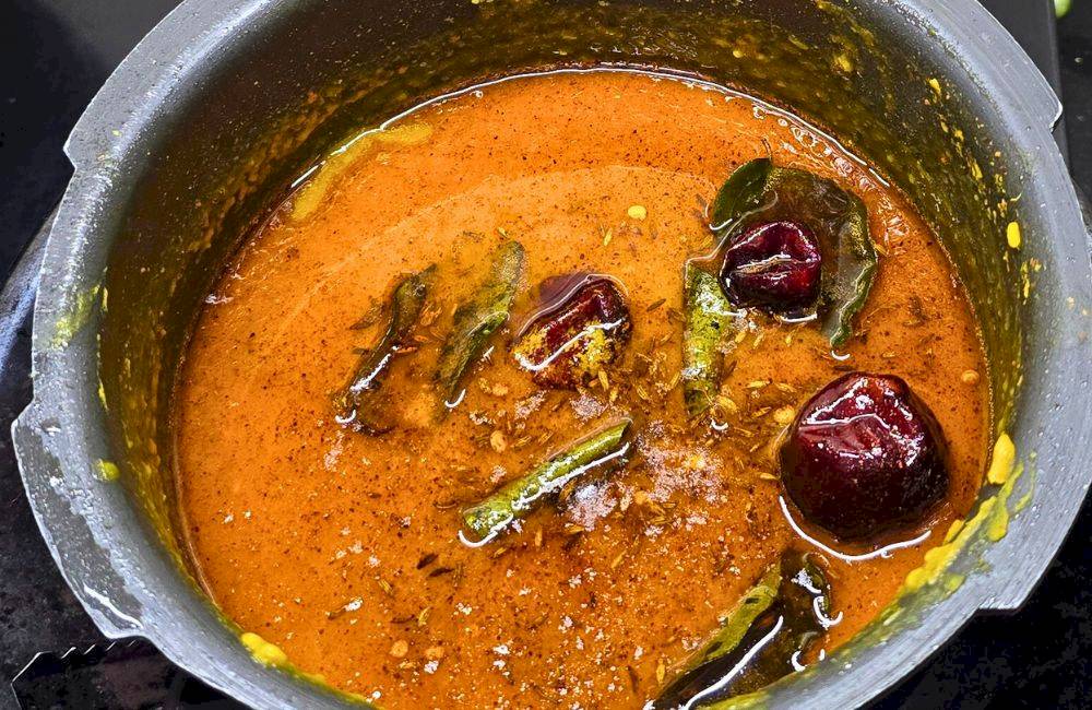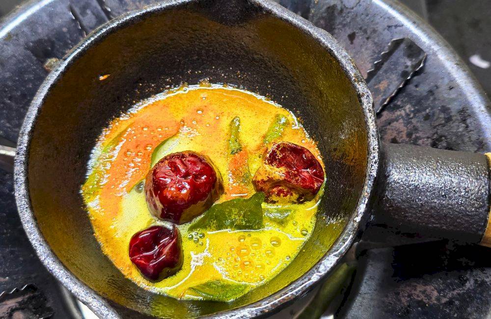 Once the oil is hot, add cumin seeds, curry leaves, and whole red chilies. Sauté for a few seconds until the spices release their aroma.