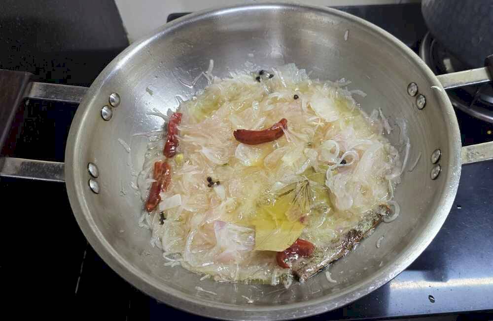 Take a pan or kadahi and heat the oil in it. Once the oil is heated add sliced onion and saute for 5 minutes or until the onions become soft. Add green cardamom, whole red chili, cloves, black peppercorns, bay leaf, and cinnamon stick and fry them until the onions are lightly golden.