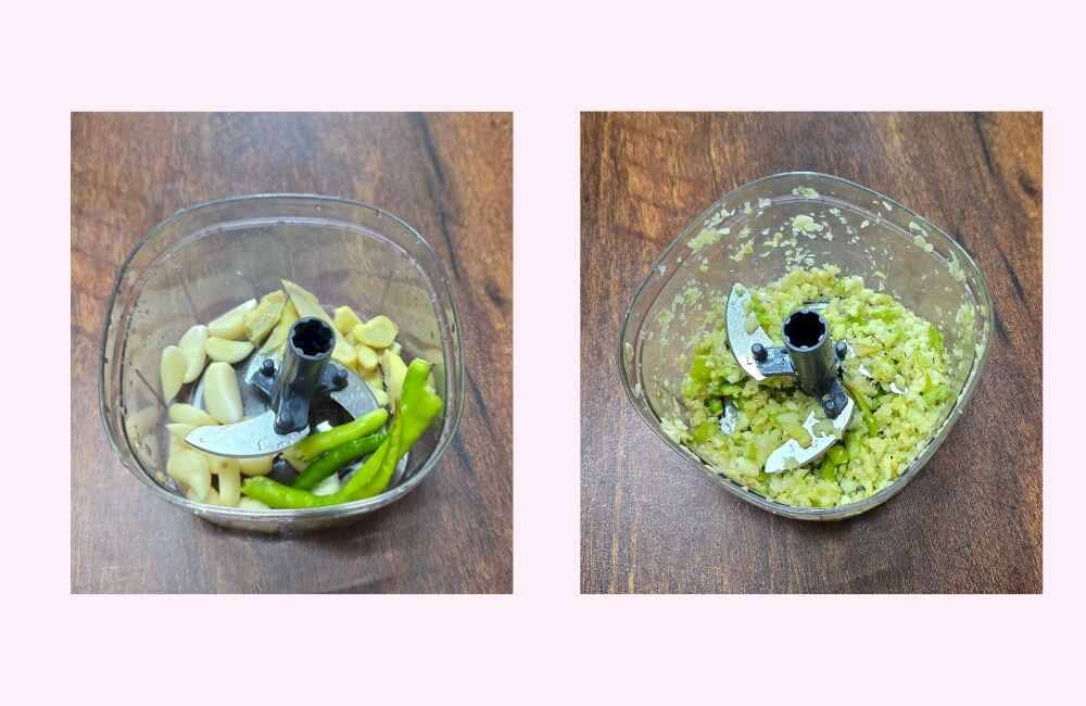 Chop the green chilies, ginger and garlic in a chopper or mortar and pestle.