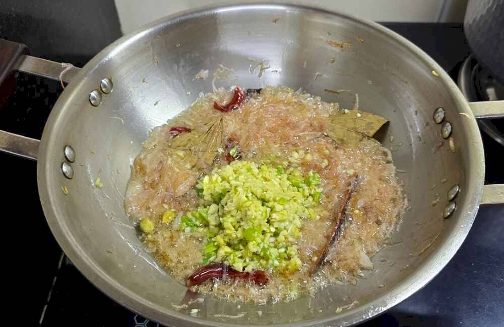 Add the chopped spices to the fried onions and roast them for 2-3 minutes.