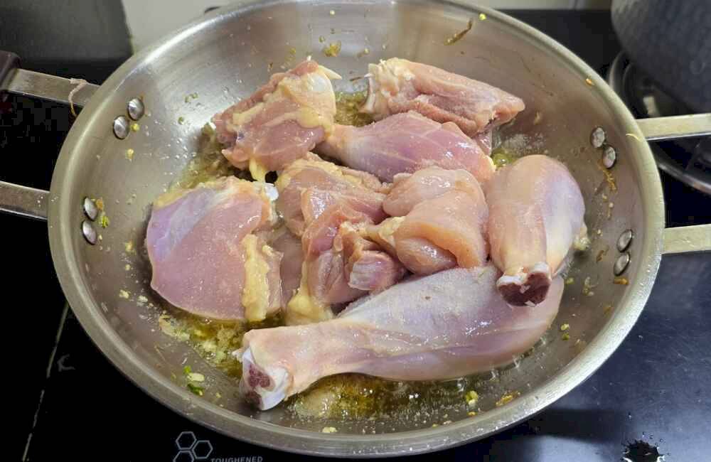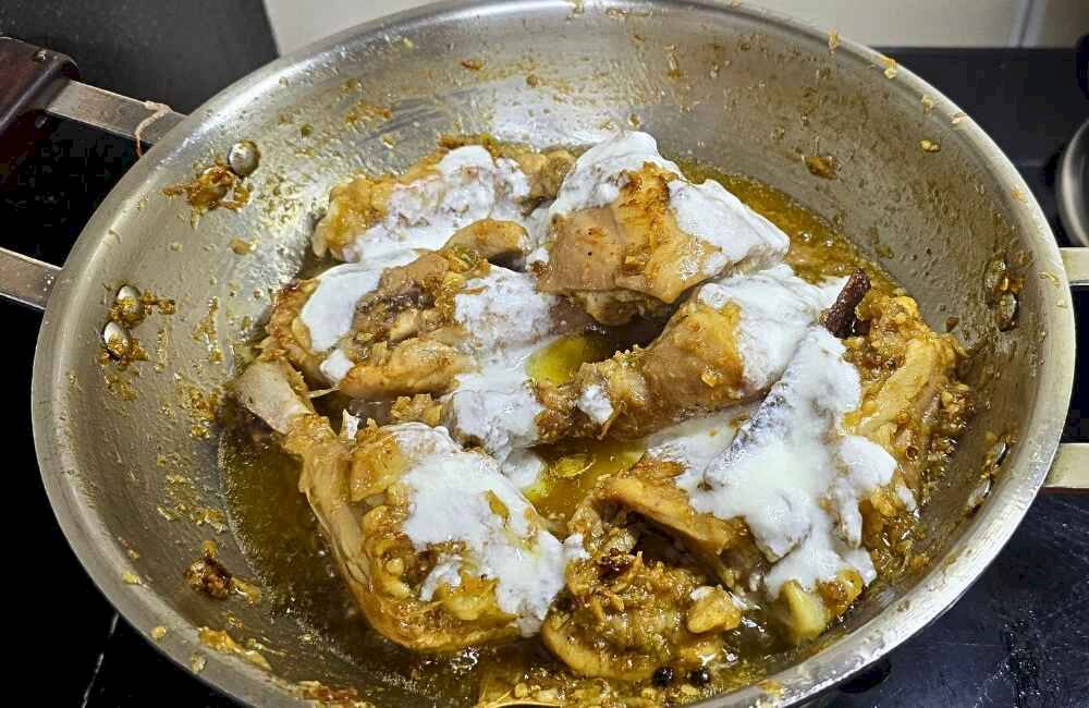 After 5 minutes add curd or yoghurt to the chicken and mix well.
