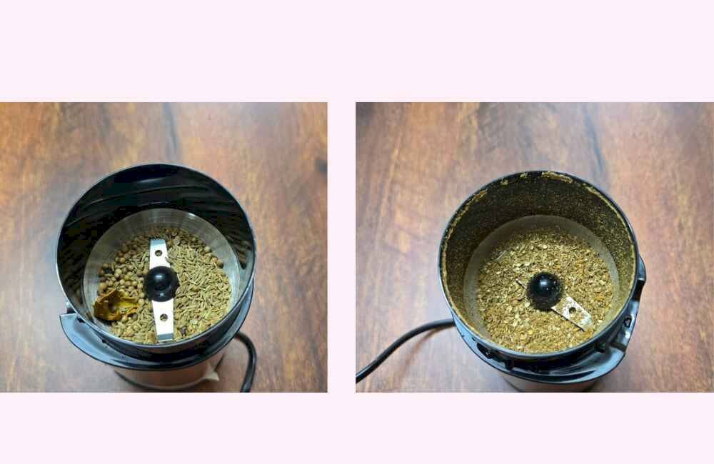 Meanwhile add roasted cumin seeds, coriander seeds, black peppercorns and mace flower to the grinder.