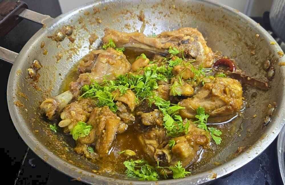 Garnish your chicken Lucknowi Khada Masala Chicken with freshly chopped coriander leaves.