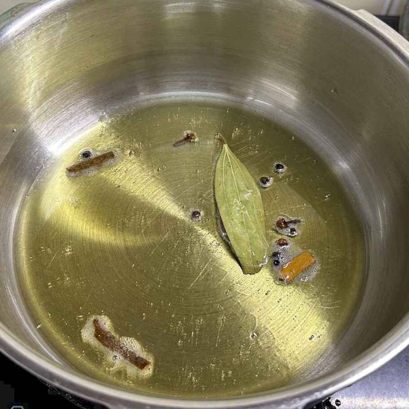 अब एक प्रेशर कुकर में 2 चम्मच तेल और 2 चम्मच घी डालकर अच्छे से गर्म कर लें। जब तेल गर्म हो जाए, तो उसमें एक तेज पत्ता, 2 छोटे टुकड़े दालचीनी, 4–5 काली मिर्च और 2–3 लौंग डालकर कुछ सेकंड तक भूनें ताकि इनकी खुशबू तेल में आ जाए।