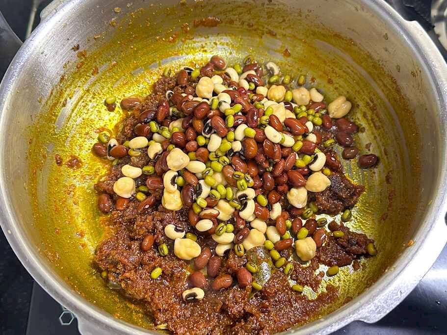 जब मसाले अच्छे से भुन जाएं, तो इसमें भिगोए हुए राजमा और बीन्स डालकर मसालों में अच्छे से मिला लें ताकि अगर इनमें पानी बचा हो तो वह सूख जाए।