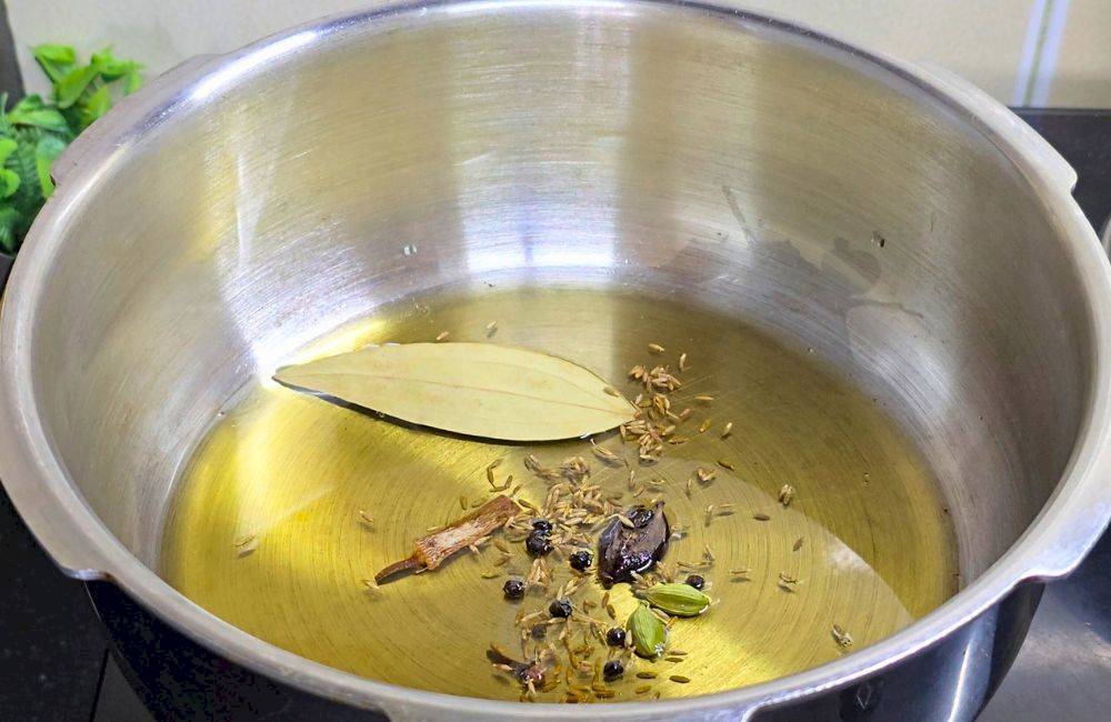 Once they are well soaked, heat about ¼ cup of oil in a pressure cooker over medium heat. When the oil is hot, add 2 green cardamoms, 6 to 8 black peppercorns, 2 cloves, A small stick of cinnamon,1 black cardamom, 1 bay leaf, ½ teaspoon of cumin seeds.