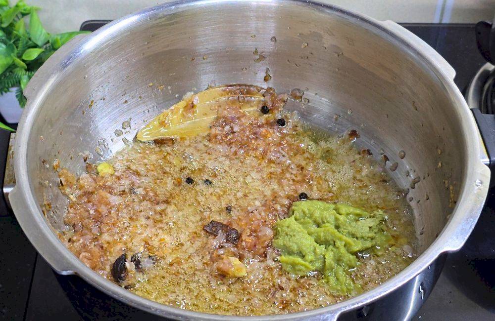 Once the onions are golden, add 2 teaspoons of ginger-garlic paste and sauté for a few seconds until the raw smell disappears.