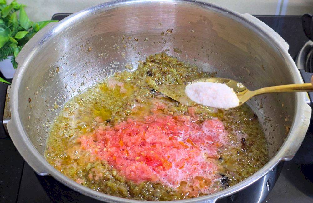 Next, add 1 finely chopped tomato, sprinkle some salt as per taste, and cook for 2–3 minutes until the tomato becomes soft and mushy.