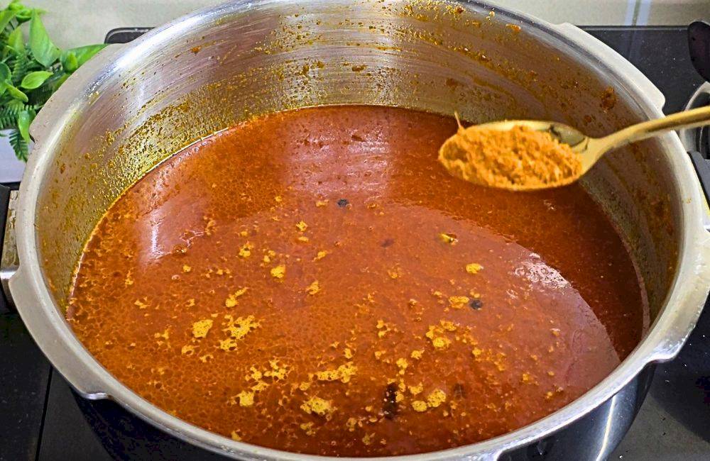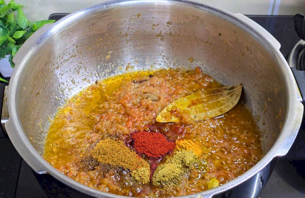 Sauté this masala well over low heat for about 3–4 minutes, stirring continuously until the oil starts separating from the sides.
