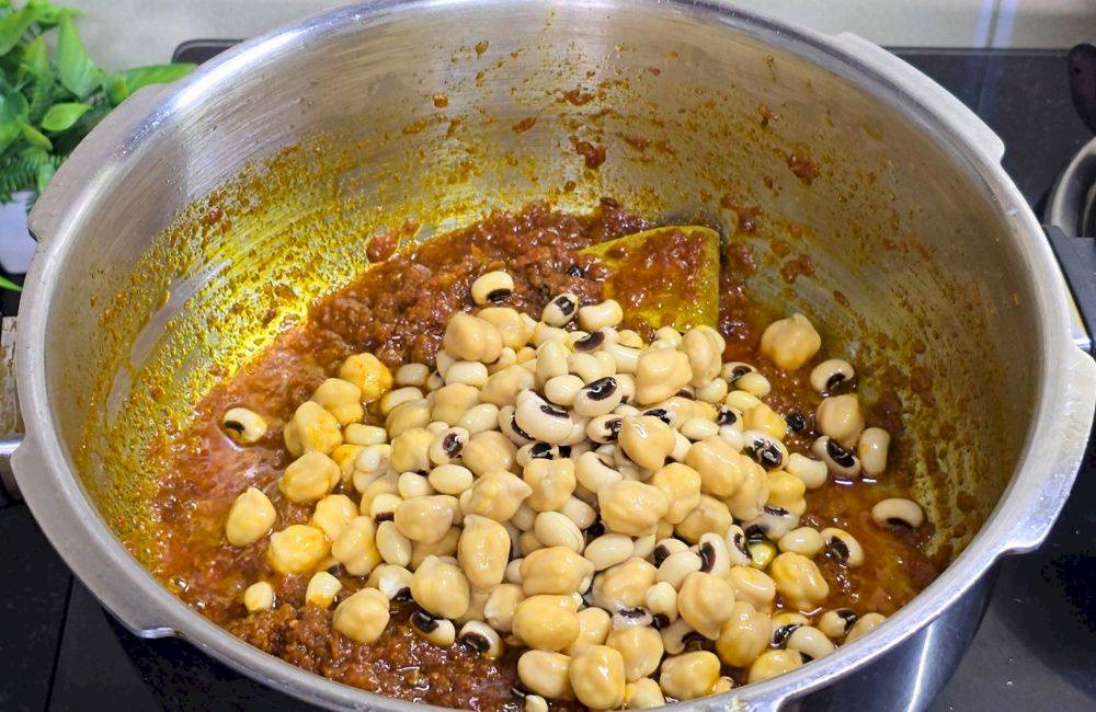 Once the masala is cooked and aromatic, drain the soaked chickpeas and lobia, add them to the cooker, and mix everything well. Cook them along with the masala for 2–3 minutes so any leftover moisture dries up and the beans absorb the spices.